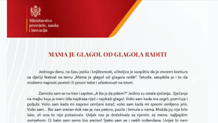 "Jednoga dana, na času jezika i književnosti, učiteljica je saopštila da je otvoren konkurs za dječiji festival na temu "Mama je glagol od glagola raditi". Takođe, saopštila je i to da možemo napisati poetski ili prozni tekst, i učestvovati na istom.