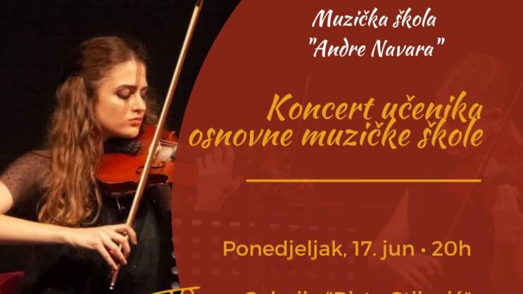 Koncert učenika Osnovne muzičke škole "Andre Navara" održaće se u ponedjeljak, 17. juna, u 20 časova, u Galeriji "Risto Stijović", najavili su iz Sekretarijata za kulturu Glavnoga grada Podgorica.