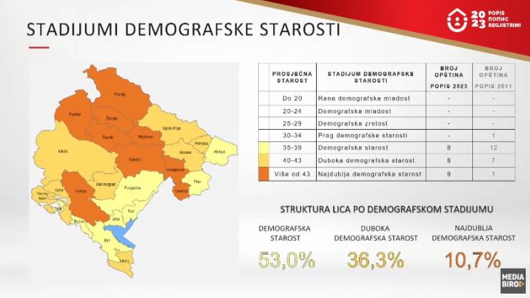 Devet opština nalazi se u stadijumu demografskog starenja. To su pokazali rezultati popisa stanovništva iz 2023. godine. Na prethodnom popisu iz 2011. godine takvu statistiku imale samo Plužine, dok je danas imaju Gusinje, Andrijevica, Kolašin, Mojkovac, Šavnik, Žabljak, Plužine, Pljevlja i Cetinje.