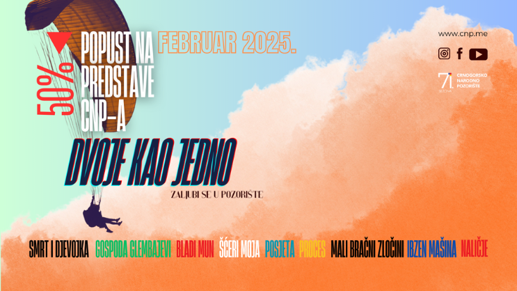 Tokom februara u CNP-u će biti izvedene predstave: „Gospoda Glembajevi“ Miroslava Krleže u režiji Danila Marunovića, „Smrt i djevojka“ Ariela Dorfmana u režiji Gorana Bulajića, „Bladi Mun“ Ane Đorđević, „Šćeri moja“ Maje Todorović u adaptaciji i režiji Ane Vukotić, „Proces“ Franca Kafke u režiji Dušanke Belade, „Posjeta“ prema Fridrihu Direnmatu u adaptaciji i režiji Aleksandra Morfova, “Mali bračni zločini” Erika Emanuela Šmita, autora Marije Đurić i Pavla Bogojevića, “Ibzen mašina” prema dramama Henrika Ibzena u režiji Ane Vukotić i “Naličje”, autorski projekat Borisa Liješevića. Cijena ulaznica za navedena izvođenja umanjuje se 50% u skladu s tradicionalnom februarskom akcijom “Dvoje kao jedno – zaljubite se u pozorište”.
