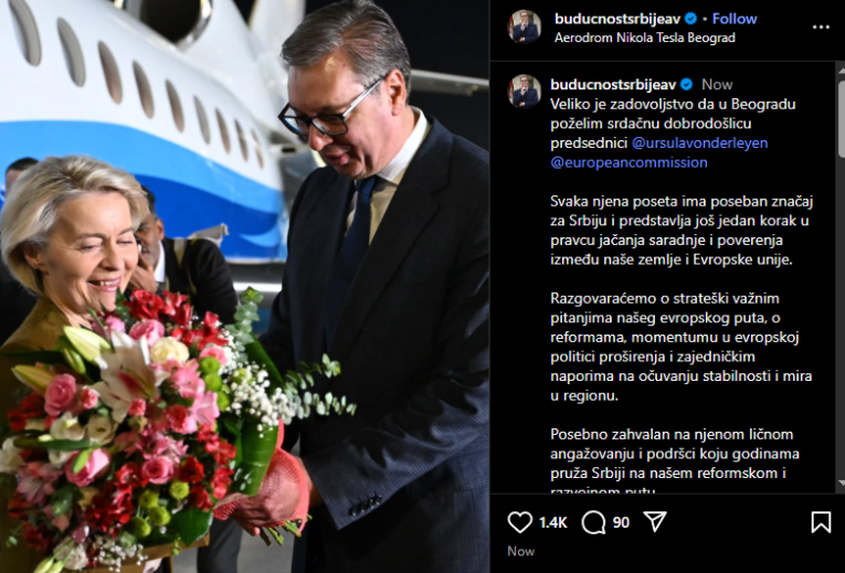 "Veliko je zadovoljstvo da u Beogradu poželim srdačnu dobrodošlicu predsjednici Evropske komisije Ursuli fon der Lajen. Svaka njena posjeta ima poseban značaj za Srbiju i predstavlja još jedan korak u pravcu jačanja saradnje i povjerenja između naše zemlje i Evropske unije," - napisao je predsednik Vučić na Instagramu.