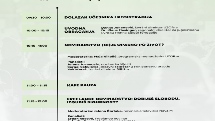 Udruženje za odgovorni i održivi razvoj – UZOR saopštilo je da organizuje konferenciju „Novinarstvo (ni)je opasno po život?", uz podršku Hanns Seidel fondacije i Evropske unije, a u saradnji sa Društvom profesionalnih novinara Crne Gore i Ministarstvom javne uprave.