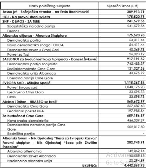 Među političkim subjektima sa značajnim iznosima su i koalicija „Aleksa i Dritan – Hrabro se broji!“ sa više od 565 hiljada eura, kao i Bošnjačka stranka, kojoj pripada skoro 390 hiljada eura. Na listi su i albanske partije i koalicije, poput Albanskog foruma – Nik Gjeloshaj, sa oko 203 hiljade eura, te Albanske alijanse, sa više od 175 hiljada eura.