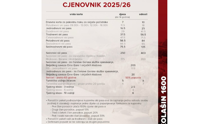 Cijene ski pasova na skijalištu Kolašin 1600 (sezona 2025/2026)