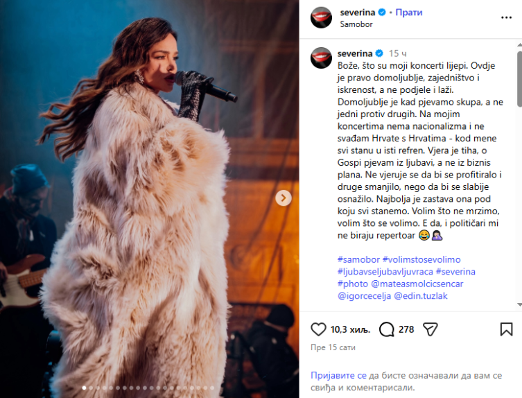 “Bože, što su moji koncerti lijepi. Ovdje je pravo domoljublje, zajedništvo i iskrenost, a ne podjele i laži. Domoljublje je kad pjevamo skupa, a ne jedni protiv drugih. Na mojim koncertima nema nacionalizma i ne svađam Hrvate s Hrvatima – kod mene svi stanu u isti refren. Vjera je tiha, o Gospi pjevam iz ljubavi, a ne iz biznis plana. Ne vjeruje se da bi se profitiralo i drugi smanjio, nego da bi se slabiji osnažio. Najbolja je zastava ona pod koju svi stanemo. Volim što ne mrzimo, volim što se volimo. E da, i političari mi ne biraju repertoar”, napisala je Severina.