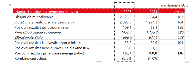 Kombinovani odnos Imovine i Zdravlja dostigao je povoljnih 93,2% (2024: 93,6%). Rezultati odštetnih zahtjeva su bili povoljni, a povećanje omjera šteta za 0,9 postotnih poena, na 66,4% prvenstveno je rezultat povećanog strukturnog rasta u području međunarodnih osiguranja. Omjer rashoda smanjio se za 1,3 postotna poena na 26,8%, jer je rast prihoda bio veći od rasta troškova. Triglav je na svim tržištima regije Adria povećao obim poslovanja, s izuzetkom jednog, te poboljšao ili održao povoljnu profitabilnost osiguravajućeg dijela svog poslovanja. Izuzetak je Bosna i Hercegovina, gdje Triglav provodi konsolidaciju vlasništva i optimizaciju svog poslovanja. Kombinovani omjer međunarodnog osiguranja i reosiguranja iznosio je 95,3%.