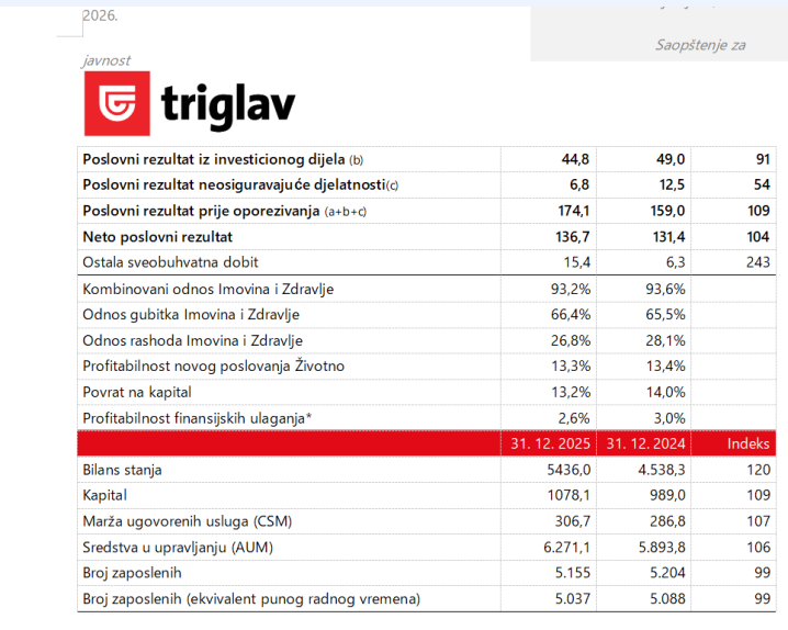 Triglav planira u 2026. godini ostvariti između 170 i 190 miliona eura poslovni rezultat prije oporezivanja, više od 2,4 milijarde eura ukupnog obima poslovanja i kombinovani odnos Imovine i Zdravlja od oko 95%.