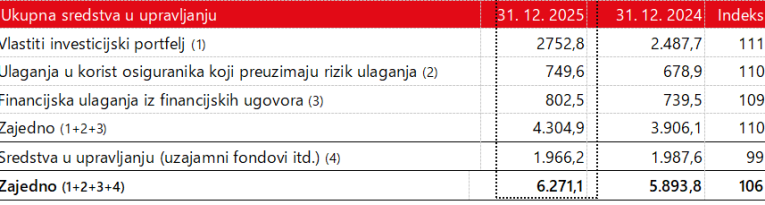 Ukupna sredstva u upravljanju Grupe Triglav su po sastavu ostala na uporedivom nivou kao na kraju prošle godine. Njihov obim se povećao za 6% na 6,3 milijardi eura. U nestabilnim uslovima na finansijskim tržištima, Grupa Triglav je ostvarila 2,6% profitabilnost na finansijska ulaganja (2024: 3,0 %), bez ulaganja u korist osiguranika koji preuzimaju investicioni rizik. Profitabilnost je uglavnom uporediva s prethodnom godinom, isključujući uticaj kursnih razlika na investicije, koje se neutraliziraju promjenama u rezervama osiguranja, i uticaj rasta poslovanja na italijanskom tržištu na vrijednost financijskih investicija.