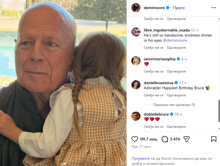 Povodom Brusovog rođendana oglasila se i njegova bivša supruga Demi Mur koja je podijelila njegovu fotografiju sa unukom.