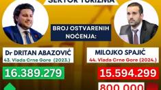 Bivši premijer Crne Gore i lider Građanskog pokreta URA Dritan Abazović na društvenim mrežama objavio je uporedio je rezultate u turizmu 2023. godine za vrijeme njegove Vlade i 2024. godine za vrijeme Spajićeve Vlade.