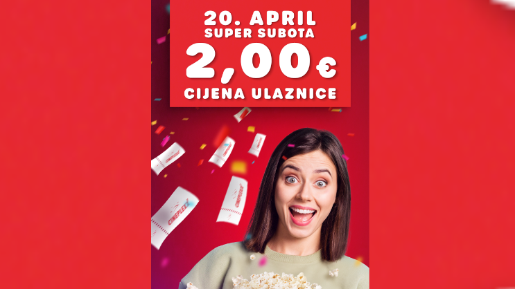 Bioskop Cineplexx Big Fashion obradovaće svoju publiku u subotu, 20. aprila, kada će se u sklopu akcije SUPER SUBOTA ulaznice za sve filmske naslove na repertoaru naći po sniženoj cijeni od 2,00€! Publika će imati priliku da uživa u najnovijim filmskim naslovima po super povoljnoj cijeni. Ulaznice su već u prodaji na blagajnama bioskopa.