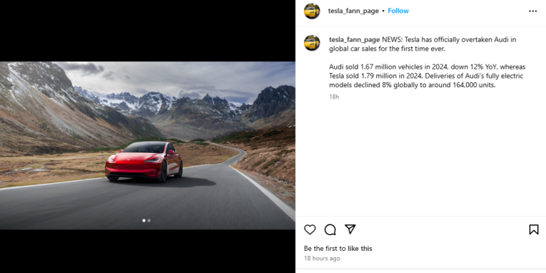 Proizvođač električnih vozila „Tesla” je po prodaji u 2024. godini prestigao njemački „Audi”, saopšteno je na osnovu analize podataka prodaje automobila.