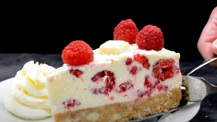 Cheesecake od bijele čokolade i malina jednostavan je i brz za pripremu. Nećete morati paliti pekaru i bit će gotov za samo 30 minuta. Preporučujemo da ga napravite dan ranije, dobro ohladiš i dekoriraš neposredno prije serviranja. Umjesto malina možeš upotrijebiti i jagode ili kupine, ovisno o tome što ti se nađe pri ruci. Uz to, obavezno upotrijebi nezaslađeno slatku pavlaku za kuvanje kako torta ne bi bila preslatka.
