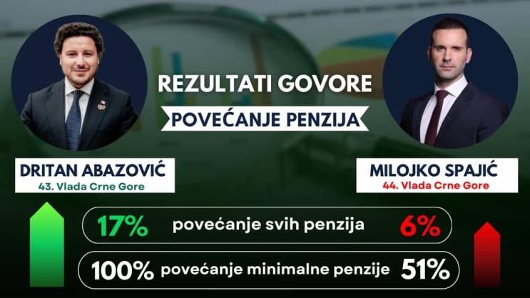 Bivši premijer i lider Građanskog pokreta URA Dritan Abazović na društvenim mrežama je objavio uporedne podatke 43. i 44. Vlade kada je u pitanju povećanje penzija.