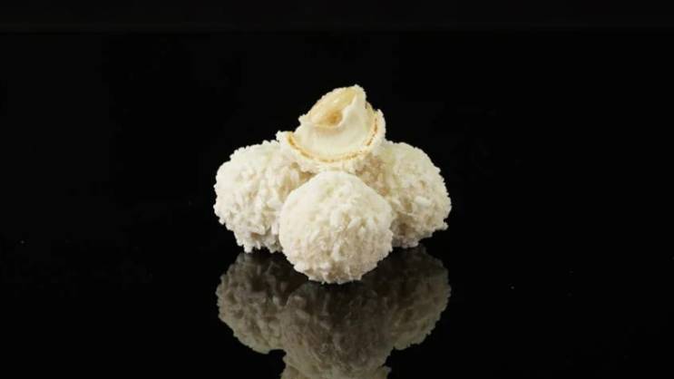 Kada se zgusnula, kašikom uzmi malo smjese, u sredinu stavi badem i od smjese oblikuj kuglicu. Dok je još ljepljiva od topline ruku, kuglicu uvaljaj u kokosovo brašno i stavi nazad u frižider da se stisne.
