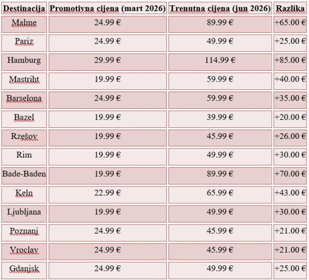 Analiza pokazuje da su WizzAirov promotivni popusti prilikom najave novih ruta iz Crne Gore, koji su se kretali između 19,99 i 29,99 eura, značajno porasli nakon samo nekoliko mjeseci. Povećanje cijena iznosi 20 do čak 85 eura po destinaciji, što znači da su karte sada dva do četiri puta skuplje od prvobitnih cijena. Najveći skok zabilježen je na ruti Podgorica–Hamburg (114,99 eura), dok je najmanja promjena zabilježena na letovima za Basel.