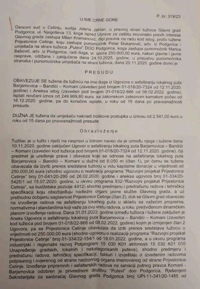 Osnovni sud u Cetinju donio je presudu kojom se Prijestonica Cetinje obavezuje da isplati iznos od 249.969,80 eura, uz zakonsku zateznu kamatu koja teče od 16. decembra 2020. godine pa do dana konačne isplate. Radi se o tužbi na ime duga iz Ugovora o asfaltiranju lokalnog puta Barjamovica - Bandići - Komani koji su krajem 2020. godine potpisali gradonačelnik Prijestonice Cetinje Aleksandar Kašćelan i gradonačlenik Glavnog grada Ivan Vuković.