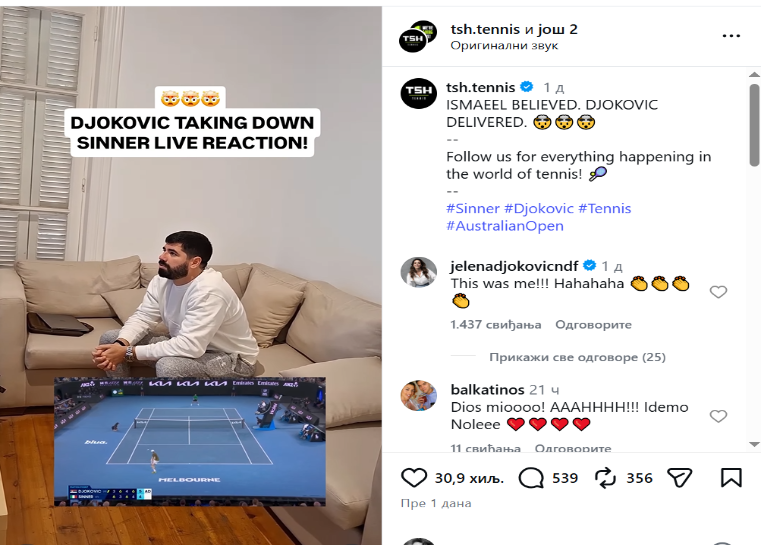 Najbolji teniser svih vremena Novak Đoković juče je pobijedio Janika Sinera u polufinalu Australijan opena. Njegova supruga Jelena Đoković ga na ovom turniru nije bodrila sa tribina, ali sve je pomno pratila iz njihovog doma, a sada je podijelila snimak na svom Instagram profilu i pokazala kako je doživljavala Novakov meč.