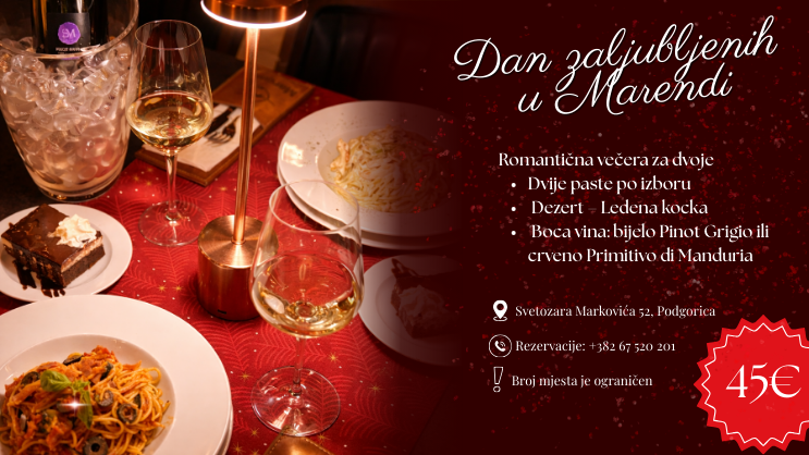 Topla atmosfera, elegantno servirana jela i pažljivo birana vinska karta čine restoran Marenda idealnim mjestom za romantičan izlazak, proslavu ljubavi ili jednostavno kvalitetno provedeno vrijeme u dvoje. Povodom Dana zaljubljenih, 14. februara, Marenda priprema posebno veče i meni osmišljen za dvoje – u znaku ukusa, emocija i nezaboravnih trenutaka.