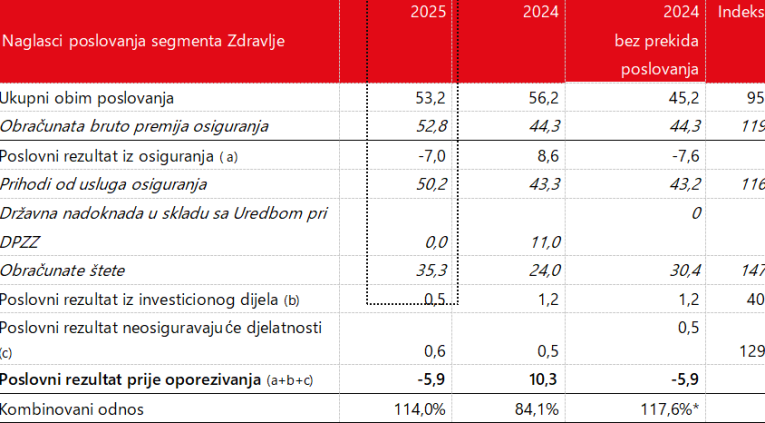 Ukupan obim poslovanja segmenta ove godine iznosio je 53,2 miliona eura (5% manje nego u 2024. godini, što je povećano zbog efekta ukidanja dopunskog zdravstvenog osiguranja). Obračunata premija osiguranja u visini od 52,8 miliona eura povećala se za 19%. Njena rast je ostvarena na svim tržištima regije.
