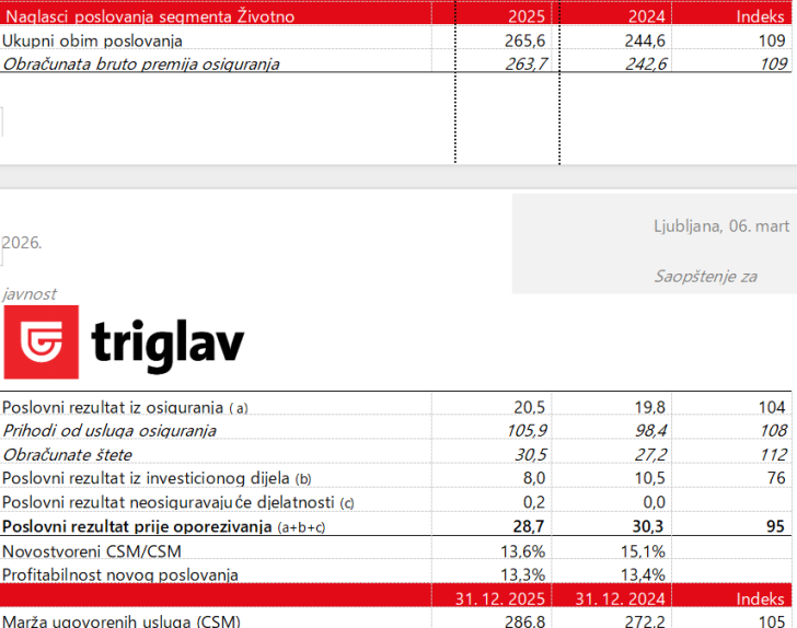Predsjednik Uprave Zavarovalnice Triglav, Andrej Slapar, je pojasnio: »Veoma smo zadovoljni našim poslovanjem u 2025. godini. Poslovali smo profitabilno i u segmentu osiguranja i u segmentu upravljanja imovinom i ostvarili visok poslovni rezultat. Ostvarili smo organski rast obima poslovanja od 9 posto i poboljšali odnosno održali dobru profitabilnost. U skladu s našom ambicioznom zacrtanom strategijom do 2030. godine, težimo daljnjoj diversifikaciji našeg poslovanja, čime jačamo našu otpornost. Zato smo u 2025. godini dodatno povećali udio poslovanja izvan Slovenije: u širem međunarodnom okruženju, povećali smo obim i profitabilno poslovali na tržištima reosiguranja, a na tržištima osiguranja smo u portfelju dodali značajan obim poslovanja s italijanskog tržišta. U budućnosti očekujemo međugodišnju volatilnost obima poslovanja na međunarodnim tržištima, uzimajući u obzir da nam obim poslovanja u segmentu osiguranja donosi prilike i u investicijskom segmentu. U skladu s rastom premije, prošle godine su porasle i naše štete, što smo uspješno upravljali razboritom reosiguravajućom zaštitom, iako nismo zabilježili veće prirodne masovne štete. Naš poslovni model ostaje uravnotežen i robustan, naša kapitalizacija je na ciljanom nivou i finansijski smo stabilni, što potvrđuju i visoki kreditni rejtinzi koje smo dobili. Ulažemo u razvoj, digitalizaciju i održivo poslovanje, čime želimo dodatno ojačati našu vodeću poziciju u regiji. U budućnost koračamo s povjerenjem – usmjereni na stvaranje dugoročne vrijednosti za naše akcionare. U ime Uprave iskreno se zahvaljujem timu saradnica i saradnikaTriglava na doprinosu u ostvarivanju naših ambicija.