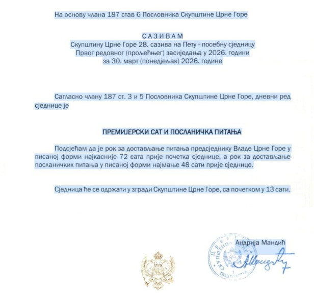 Predsjednik Skupštine Andrija Mandić zakazo je za 30.mart petu posebnu sjednicu prvog redovnog proljećnjeg zasijedanja. Na dnevnom redu je premijerski sat.