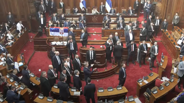 Sjednica Skupštine Srbije prekinuta je danas oko 11.20 kada su poslanici opozicije napustili svoje klupe i aktivirali pirotehnička sredstva u sali.